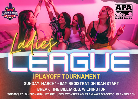 2026 Ladies League Playoff Tournament will be held at Breaktime Billiards on Sunday, March 1st.