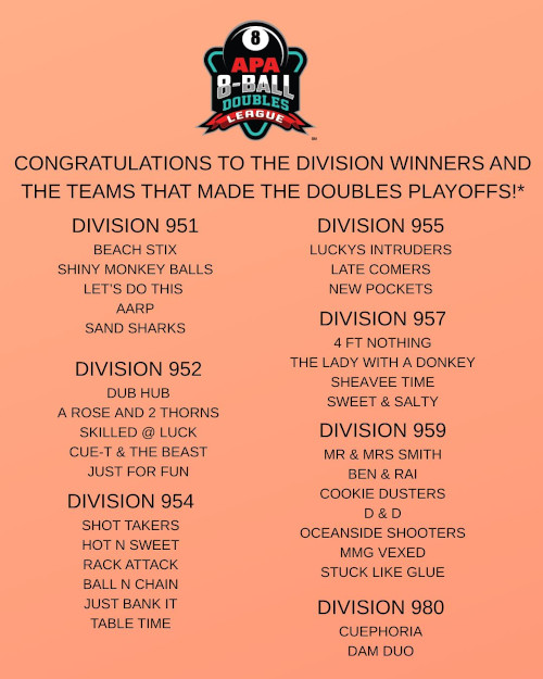 Tags: APA 8-Ball Doubles LeagueAPA 8-Ball Doubles League PlayoffsAPA 9-Ball Doubles LeagueAPA 9-Ball Doubles League Playoffs