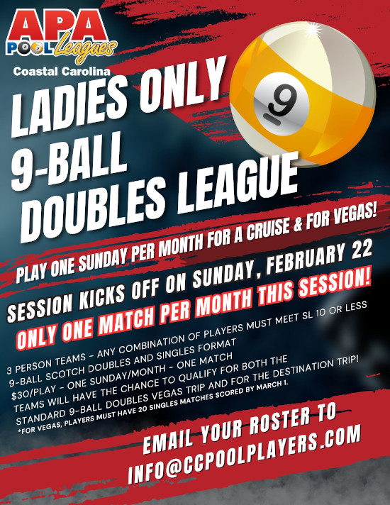 Ladies only 9-Ball doubles league starting on Sunday, February 22nd. Play one Sunday per month for a cruise & for Vegas.