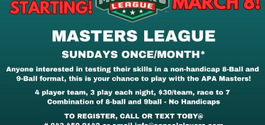Good Luck to all the Coastal Carolina APA players who qualified for the 8/9 ball singles regionals.