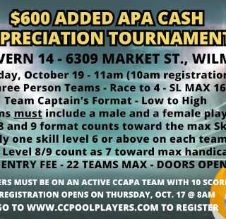 3 Person Team Appreciation tournament at Tavern 14 on Sunday, October 19th @ 10am.Max Skill Level 16. $60 team entry fee. Registered Teams Waitlist Teams