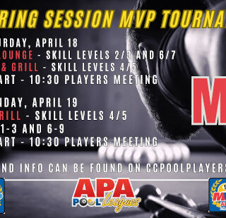 APA 8-Ball MVP tournament will be on Saturday, April, 18th and the APA 9-Ball MVP tournament on Sunday, April, 19th. MVP Tournament registration opens on Thursday, April 16th @ 8am...